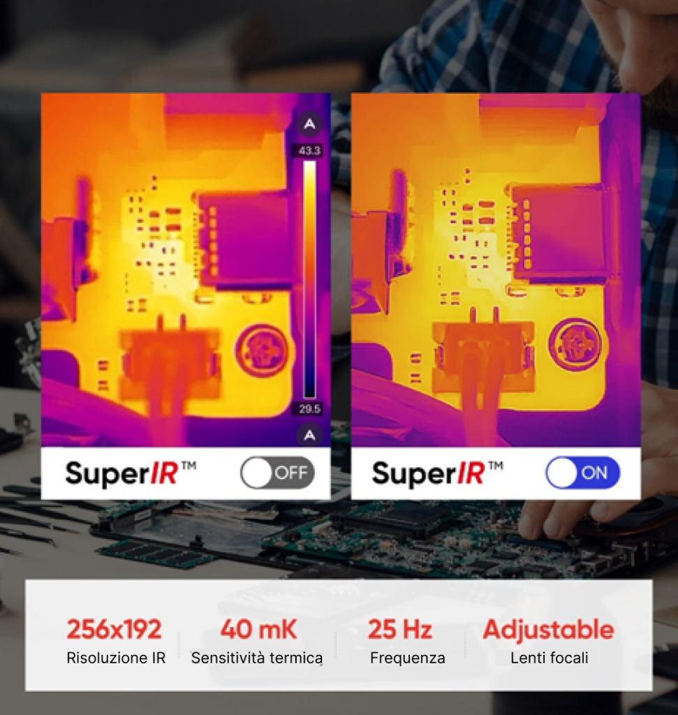 Queste piccole termocamere offrono un’impareggiabile qualità di immagine grazie alla speciale tecnologia di elaborazione visiva SuperIR già sperimentata su termocamere di alto livello.