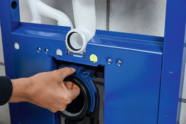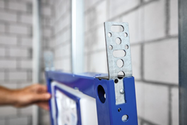 Con la nuova piastra di fissaggio laterale estraibile, inoltre, viene risolto il problema della difficoltà di fissaggio laterale di viti, per ragioni di spazio. Grazie a questa piastra, collocata nel telaio estraibile, è possibile eseguire l’avvitamento al montante dall’interno in caso di installazioni a tutta altezza. Inoltre, grazie all’aggiunta di indicatori sul telaio blu, non devono più essere prese ulteriori misure, a vantaggio di un risparmio di tempo per installare i vitoni dello scarico.