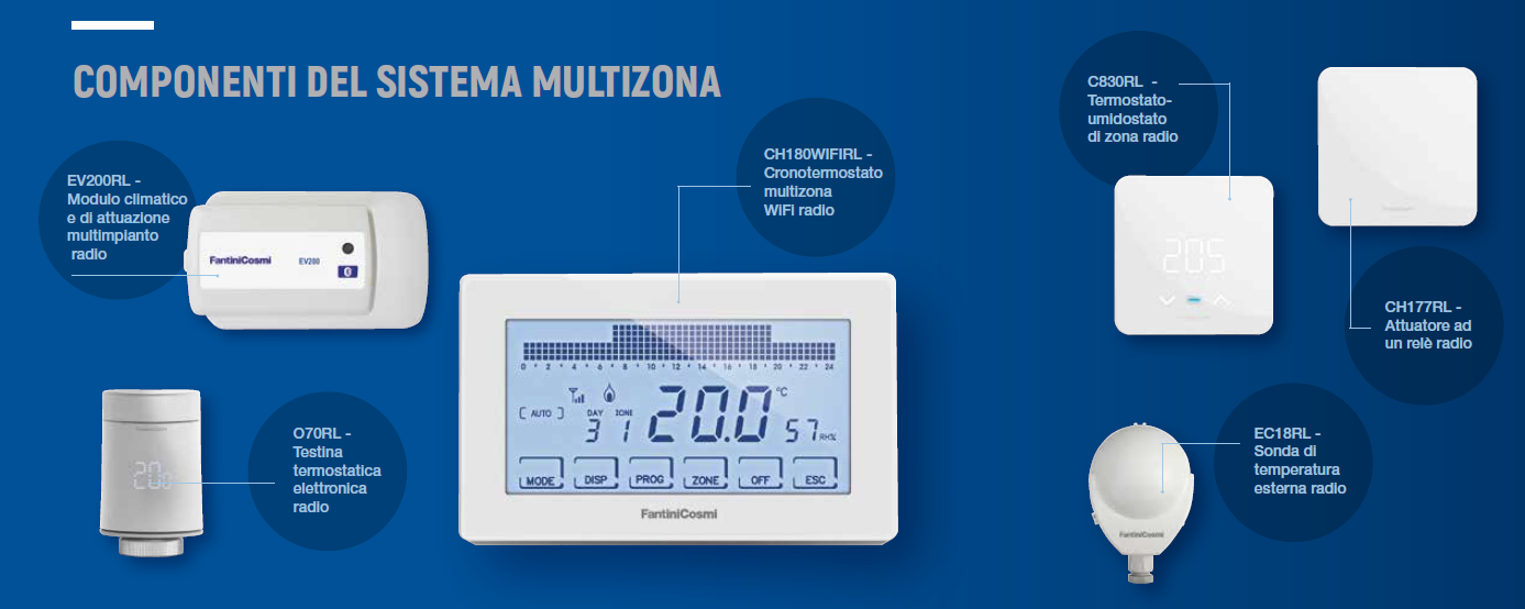 Il cuore del sistema è rappresentato dal cronotermostato multizona WiFi radio CH180WIFIRL che comunica con tutti gli altri componenti: