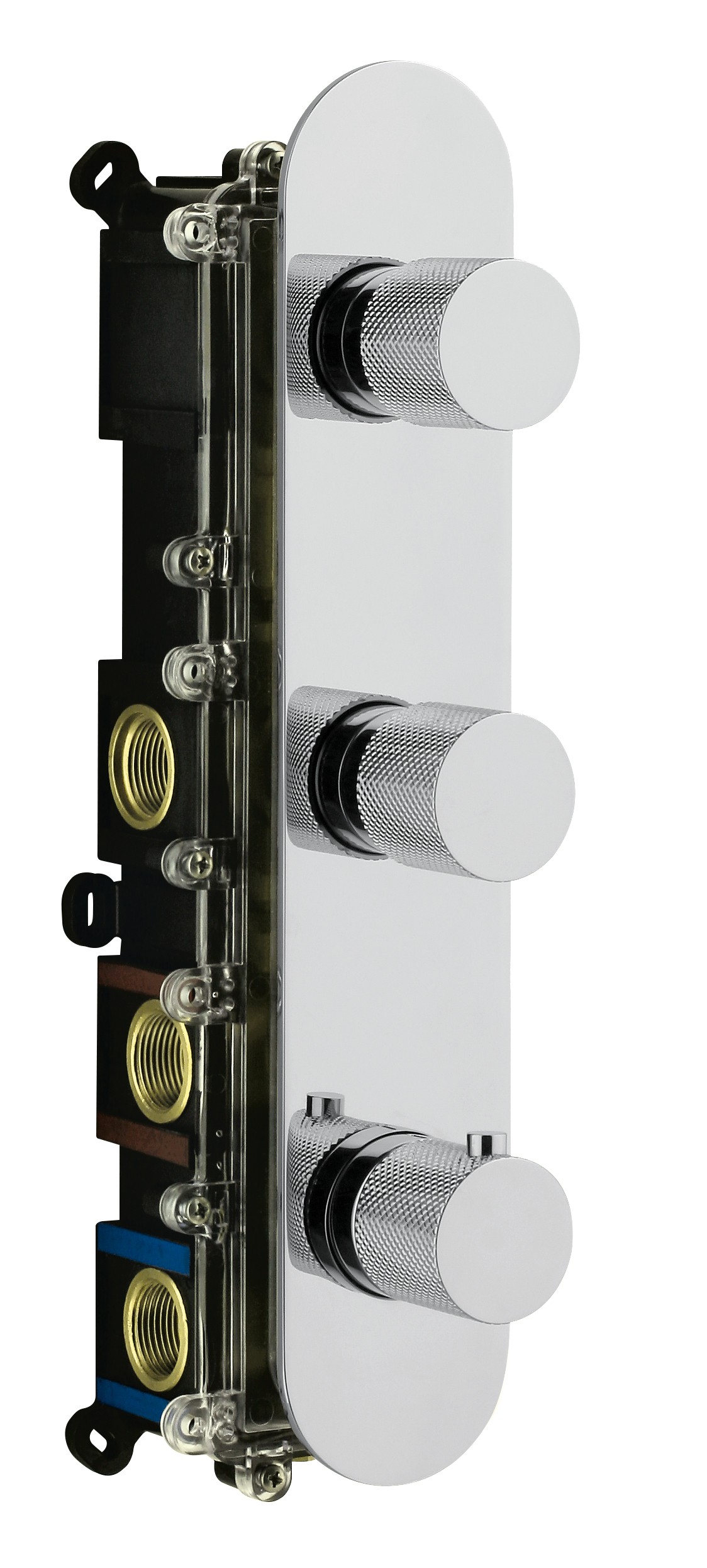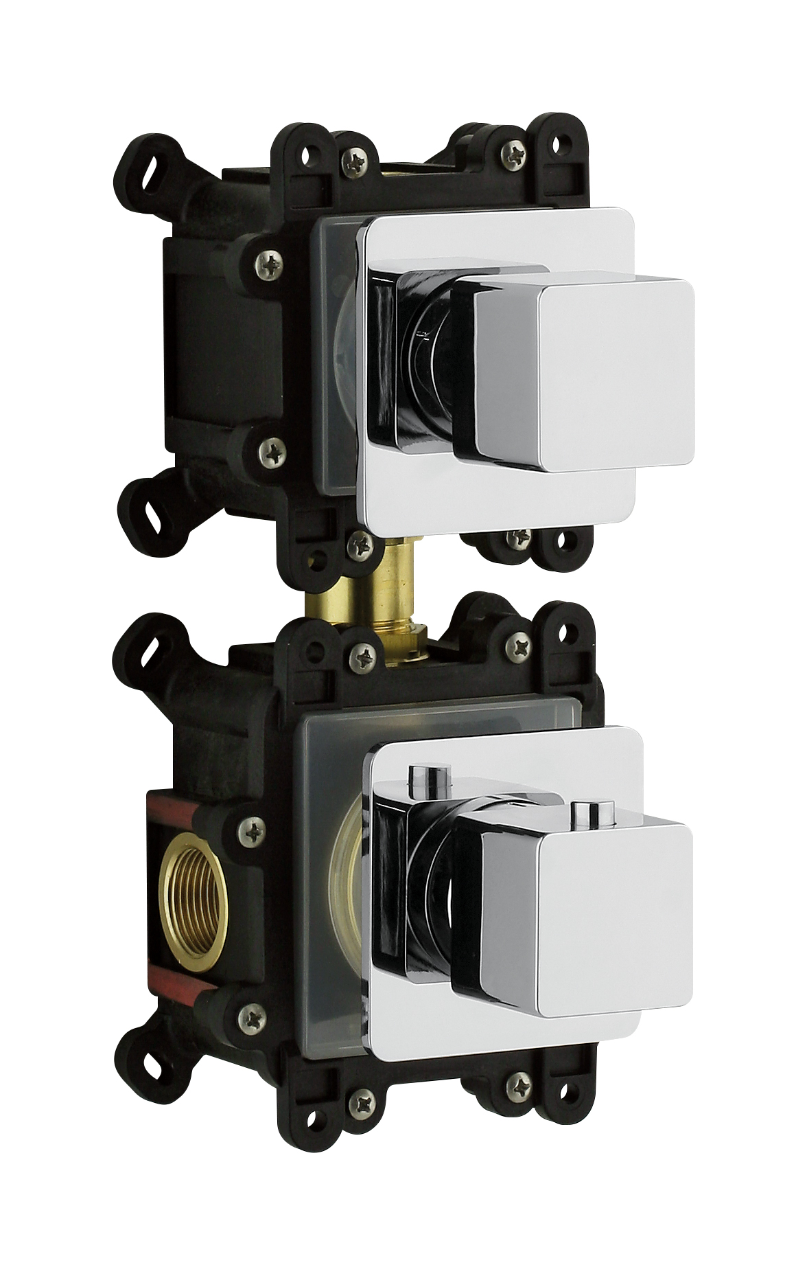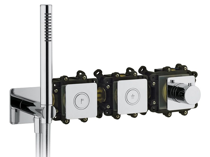 Il funzionale sistema che correda alcune serie OMBG viene fornito con il miscelatore termostatico già preinstallato e permette di completare in pochi semplici passaggi le operazioni di installazione.