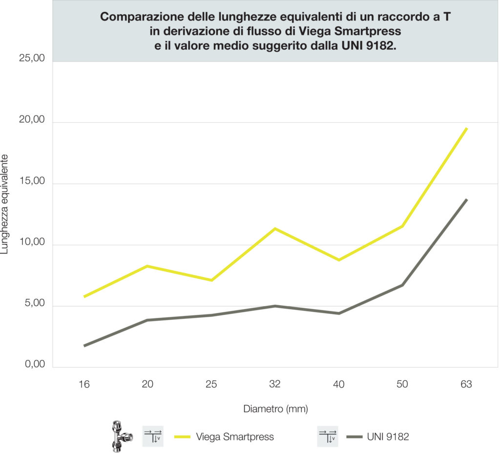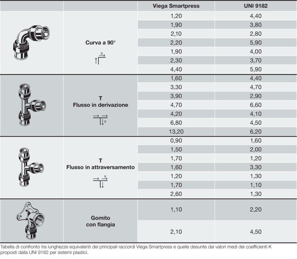 Le differenze tra i valori medi suggeriti dalla norma e quelli dei raccordi Viega Smartpress di Viega (Crespellano, BO) sono particolarmente evidenti, anche paragonandoli in termini di di lunghezze equivalenti (ovvero la perdita di carico del raccordo espressa in metri di lunghezza di tubo di pari diametro).