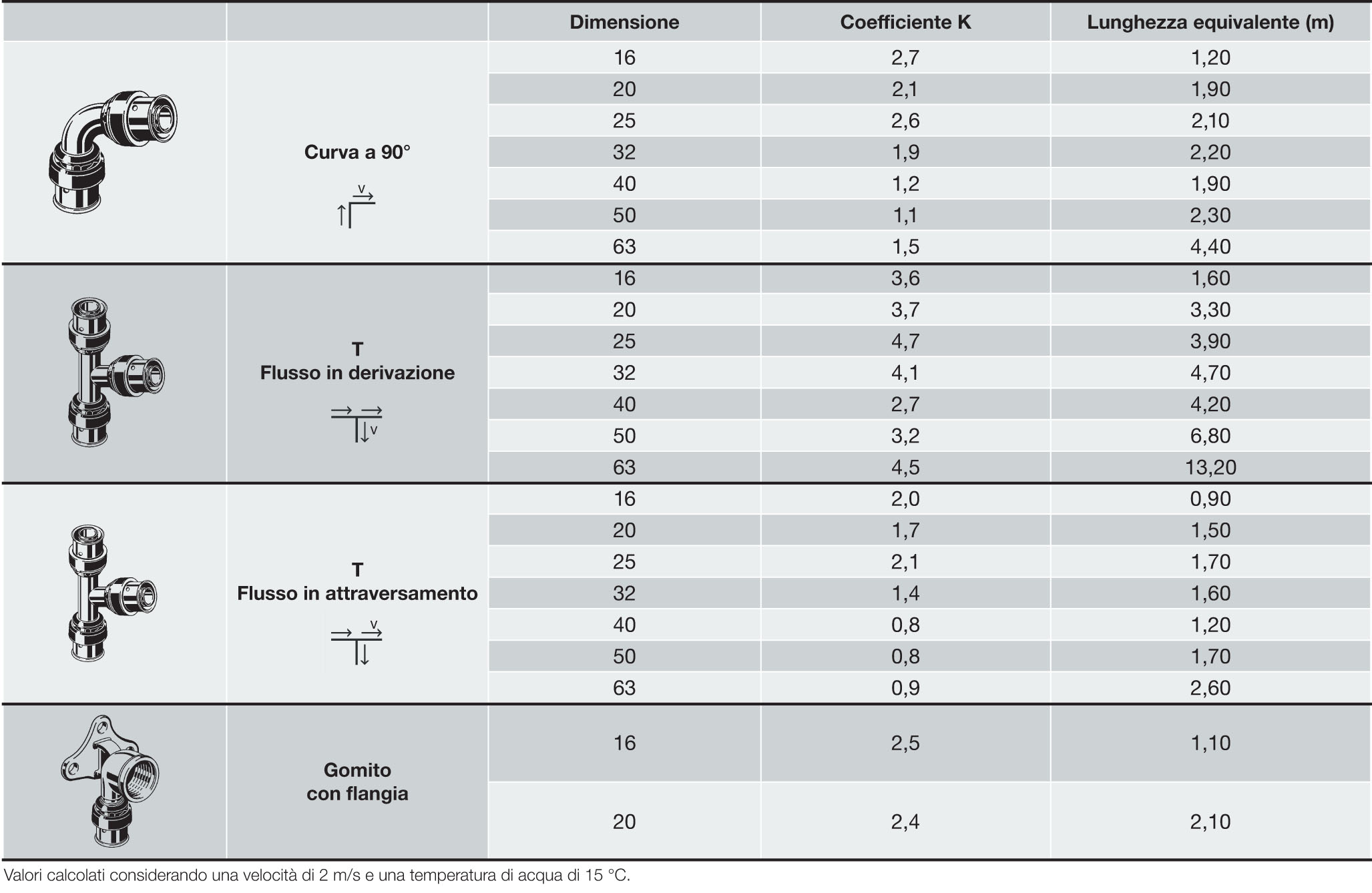La tabella di conversione che segue converte il coefficiente K dei principali raccordi Viega Smartpress in termini di lunghezza equivalente.