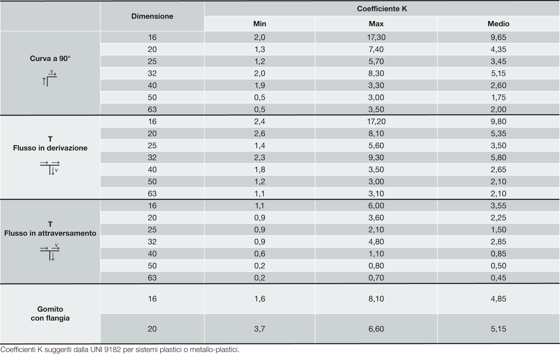 Le prestazioni idrauliche possono variare a tal punto che per ogni tipo di raccordo e per ogni dimensione è previsto un valore massimo e uno minimo, con gap spesso notevoli tra uno e l’altro. La stessa norma permette di adottare un valore medio per il dimensionamento dell’impianto nel caso in cui i coefficienti K non fossero dichiarati dal produttore.