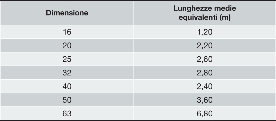 In media si può quindi affermare che, ad ogni utilizzo di un raccordo Viega Smartpress di diametro di 16 mm, si ha una perdita di carico pari a quella di 1,2 metri di tubo di pari misura. Questo valore tende ovviamente ad aumentare di pari passo con il diametro, raggiungendo misure medie pari a quelle indicate nella tabella sotto: