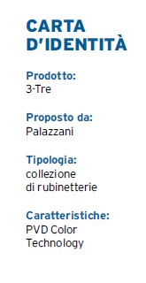 Palazzani propone 3-Tre, collezione di rubinetterie disegnata da Andrea Zani, che fonde le più innovative e avanzate tecnologie costruttive e di finitura con la ultracentenaria maestria artigiana dell’azienda. Come un quadro, un affresco o una scultura d’autore, gli elementi a muro, a soffitto e a pavimento della collezione 3-Tre catturano l’attenzione per la cura dei dettagli e il loro design pulito e raffinato, in grado di integrarsi armoniosamente in qualsiasi stile di arredamento della sala da bagno.