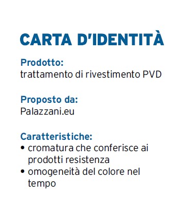 Per l’utilizzatore finale, il rubinetto Palazzani trattato con la PVD Color Technology è paragonabile per durata e resistenza, seguendo le necessarie avvertenze e istruzioni d’uso, a un rubinetto cromato di alta qualità.