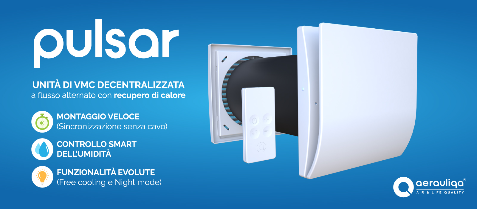 PULSAR VMC decentralizzata a singolo flusso alternato con recupero di calore, disponibile in due varianti (100 e 150), a bassissimo consumo energetico (min.1,2W), con controllo evoluto dell’umidità. Garantisce un ricambio d’aria continuo e quindi la rimozione di CO2, degli inquinanti indoor, prevenendo anche problemi di condensa e muffa. È una soluzione adatta a soggiorni e camere da letto (fino a 45mq) dal design elegante e dalle linee minimaliste. La sincronizzazione tra più unità avviene senza cavo.