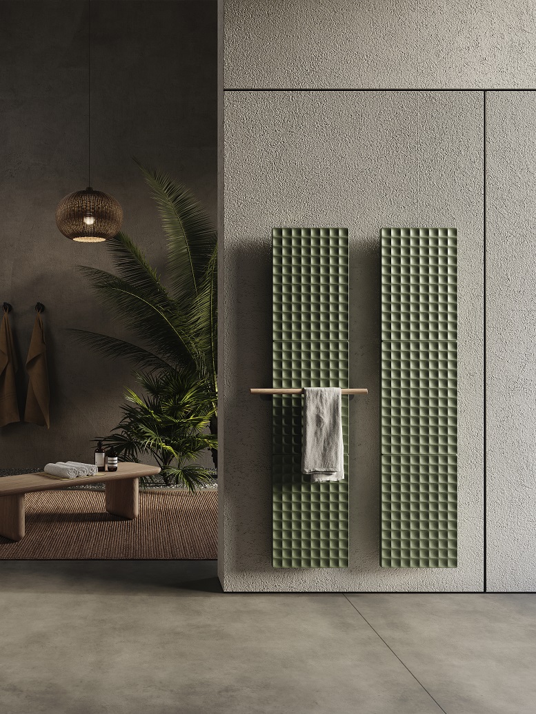 La sua estetica morbida, la sua trama a rilievo – secondo il disegno di Piero Lissoni -, oltre alla possibilità di essere configurato nelle dimensioni a partire da un modulo rettangolare, si uniscono poi all’alto potere radiante e all’elevato rendimento termico.