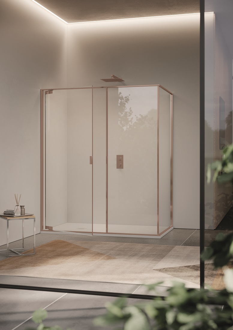 La leggerezza strutturale è assicurata dai profili in alluminio di appena 15 mm, caratteristica che enfatizza il concept estetico. Per la serie sono disponibili soluzioni sia a battente pivotante sia scorrevole, con cuscinetti piccolissimi e incollati UV per risultare quasi invisibili, declinate anche per angolo e per nicchia.