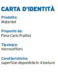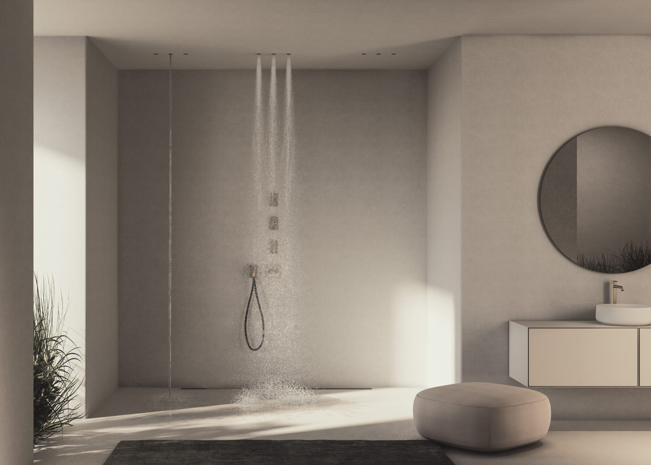 La superficie del soffione è disponibile in quattro texture: la lavorazione tridimensionale “X”, la preziosa godronatura “G”, l’effetto a righe verticali dal mood hi-tech “P” e Flat che, nelle versioni Frame e 7bd9Trimless, consente di integrare perfettamente il soffione al soffitto. Completano il sistema cinque tipologie di flusso d’acqua – il tradizionale getto rain, il laminare, il nebulizzato, il mikado a intreccio e l’energy con tre mi crogetti – che rendono il progetto altamente componibile. Proprio come punti luce, i microsoffioni Waterdot possono essere posizionati liberamente per creare aree doccia di diversa estensione.