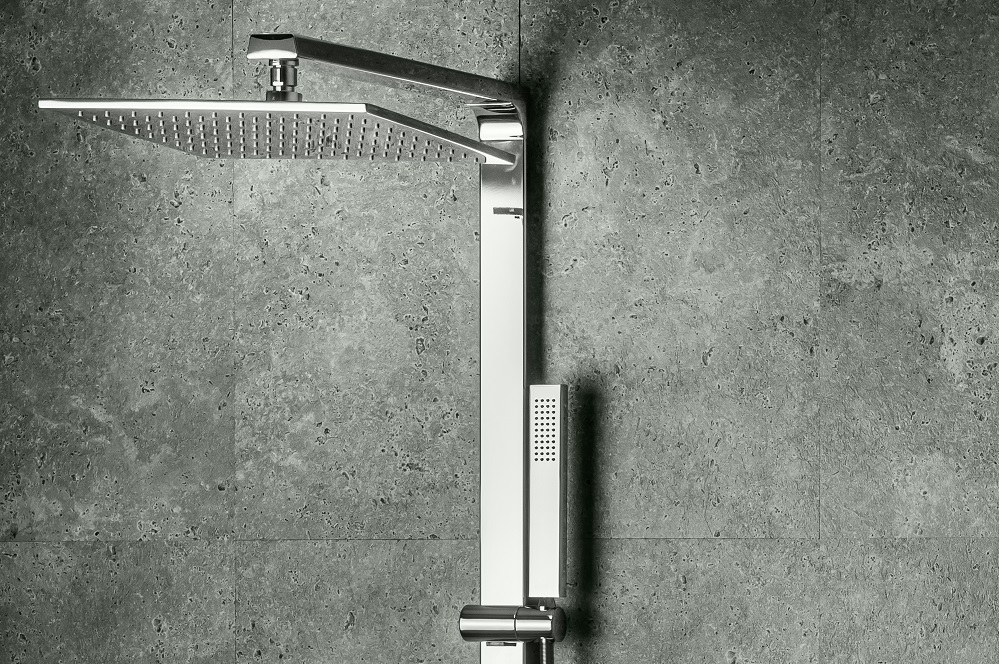 CONCEPT TWO completa la proposta della #doccetteria Damast.: l’asta filo muro del saliscendi CONCEPT ONE si allunga fino a diventare colonna doccia dotata di braccio doccia e soffione rettangolare SUPERNOVA, anticalcare e ispezionabile.