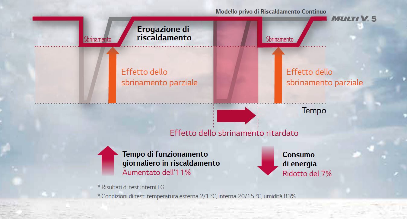 MULTI V 5 avvia lo sbrinamento parziale e lo sbrinamento ritardato dell’unità esterna in base alle rilevazioni del sensore di umidità del Dual Sensing Control, in modo da migliorare l’efficacia del Riscaldamento Continuo, aumentando di conseguenza la capacità di riscaldamento e il comfort climatico con un aumento dell’11% del tempo di erogazione del riscaldamento e una riduzione del 7% dell’energia utilizzata.