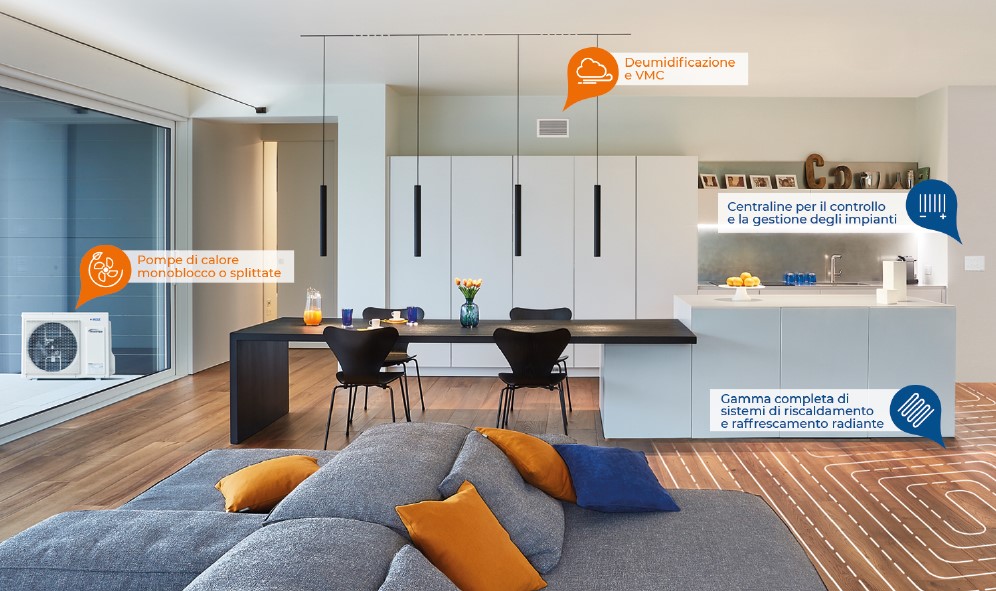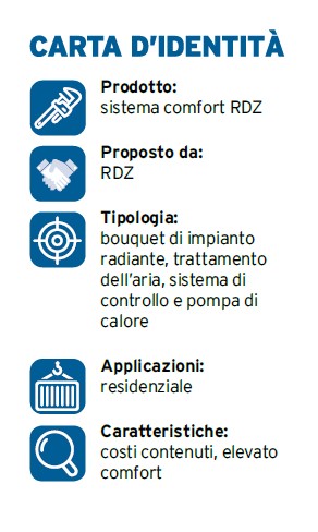 Il sistema comfort proposto da RDZ è un bouquet di impianto radiante, trattamento dell’aria, sistema di controllo e pompa di calore che risponde in maniera concreta all’emergenza energetica attuale. La tecnologia che ne sta alla base, infatti, consente di assicurare il clima ideale negli edifici, contenendo i consumi.