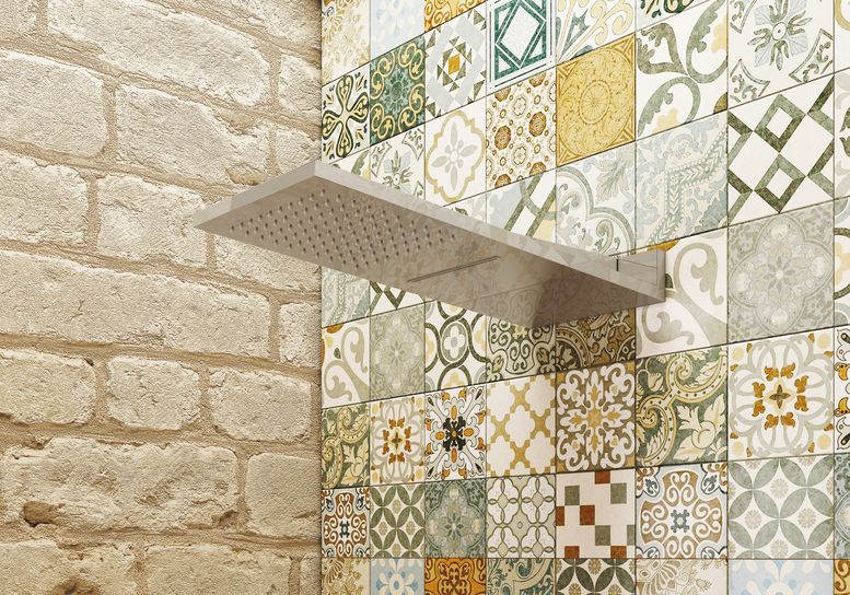 Per la doccia, tra le soluzioni protagoniste di questa ambientazione spicca ANTARES 2, soffione in acciaio inossidabile dal carattere deciso e raffinato. Le sue linee generose (500×220 mm) offrono due modalità di getto: la pioggia avvolgente per un momento di quiete e la cascata energizzante per un risveglio dei sensi. La superficie super-mirror, con ugelli anticalcare, moltiplica la luce creando un dialogo continuo con lo spazio. Il sistema easy-clean garantisce praticità e manutenzione rapida. Completano la composizione la doccia a mano geometrica LEO, il flessibile coordinato e il miscelatore a due vie, perfettamente integrati anche in ambienti dalla forte impronta materica.