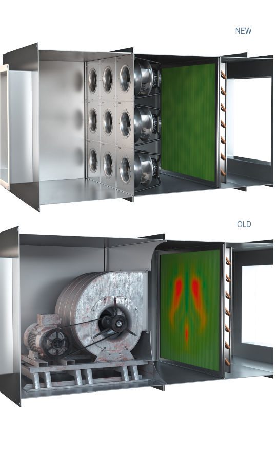 Per la movimentazione di grandi quantità d’aria, in passato sono stati installati ventilatori delle più grosse taglie. Nella ventilazione moderna, una vera e propria parete di ventilatori assiali o centrifughi con tecnologia EC GreenTech – la cosiddetta FanGrid – lavora in parallelo per la medesima unità. I ventilatori sono sincronizzati uno con l’altro per ottenere il massimo della performance all’interno di un design estremamente compatto. Grazie al software di ebm-papst (Mozzate, CO) FanScout è possibile inoltre selezionare la combinazione di ventilatori ottimale per le specifiche esigenze.
