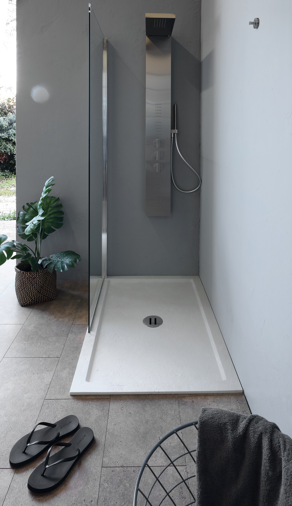 I piatti doccia Super Slim sono la soluzione ultra sottile per rendere “reale” la zona doccia ideale. Grazie allo spessore di 1,2 cm garantisce la massima continuità estetica fra pavimento e zona doccia, per un effetto di eleganza e di linearità. Il bordo capiente consente la massima tenuta evitando la fuoriuscita dell’acqua anche in caso di installazione a filo pavimento. Super Slim è realizzato con un composito di minerali naturali e resina; la particolare texture antiscivolo conferisce alla superficie del piatto doccia un effetto elegante. È disponibile in due tonalità: bianco e grigio.
