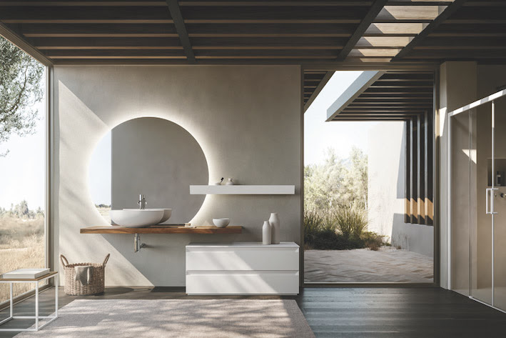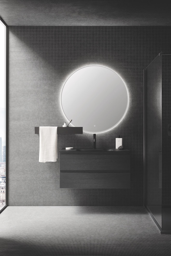 La specchiera Compass è invece la soluzione retroilluminata, perfetta per offrire una luce diretta, intensa ed uniforme alla composizione Street. È disponibile in 3 dimensioni – ø 85 cm, ø 100 cm, ø 120 cm – con luce led perimetrale continua 4000 k e interruttore touch per accensione/spegnimento.