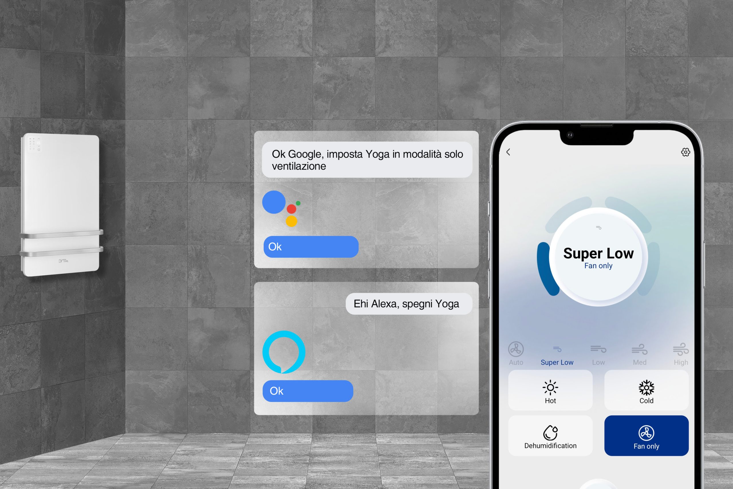 Yoga è Wi-Fi Ready e, con aggiunta di Wi-Fi+, è utilizzabile con app dedicata. Struttura e mantello sono in acciaio con doppia verniciatura a polvere di colore bianco. Flap uscita aria con apertura orientabile manualmente. È completo di vasca di raccolta condensa per installazione verticale, filtro estraibile a trama sottile. Attacchi lato destro ¾ M.