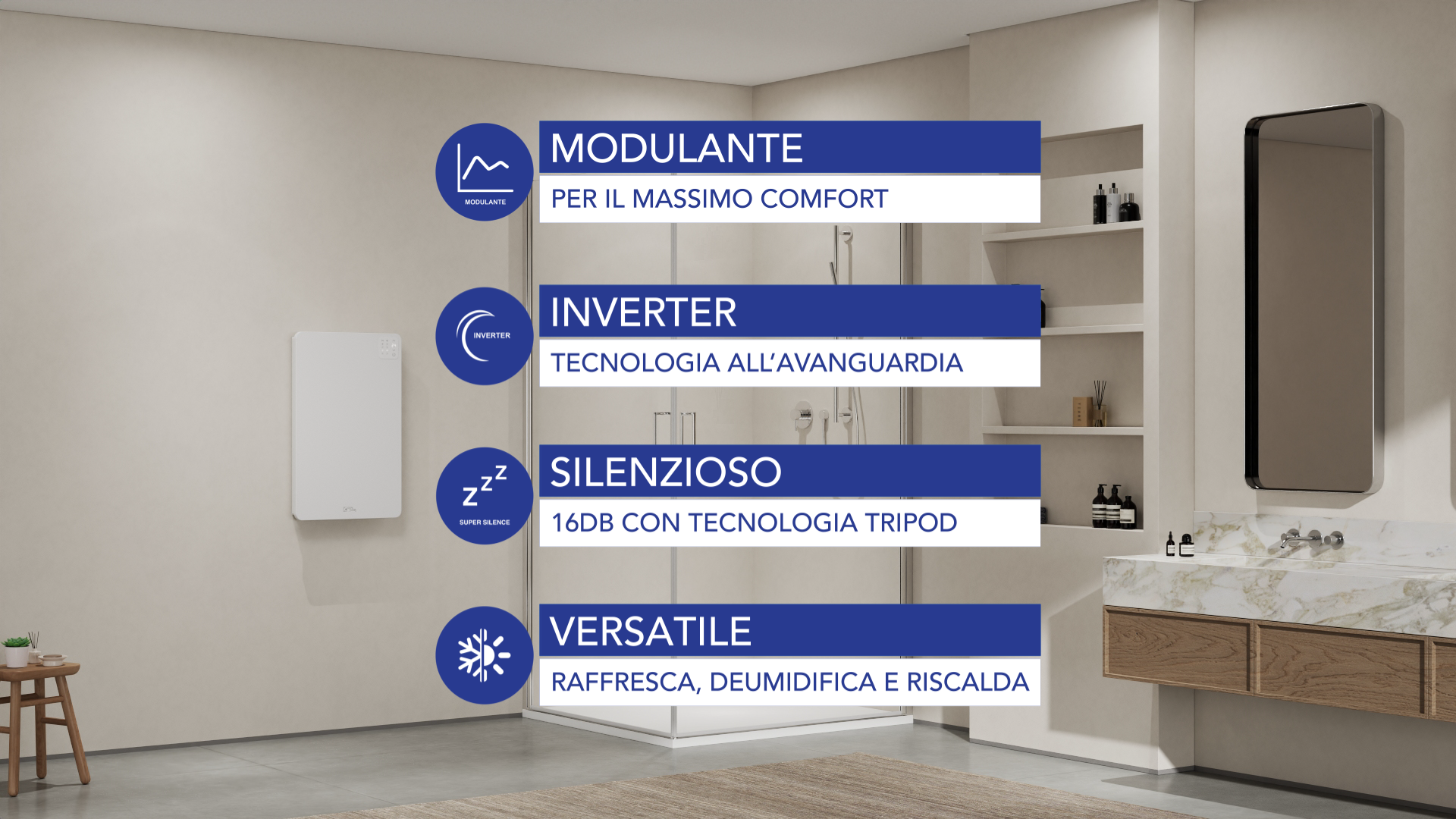 Yoga di Ideal Clima (Brescia) è la soluzione completa per la climatizzazione idronica in bagni e lavanderie, sia in estate che in inverno, sfruttando a pieno le pompe di calore reversibili o in solo riscaldamento con le caldaie a condensazione.