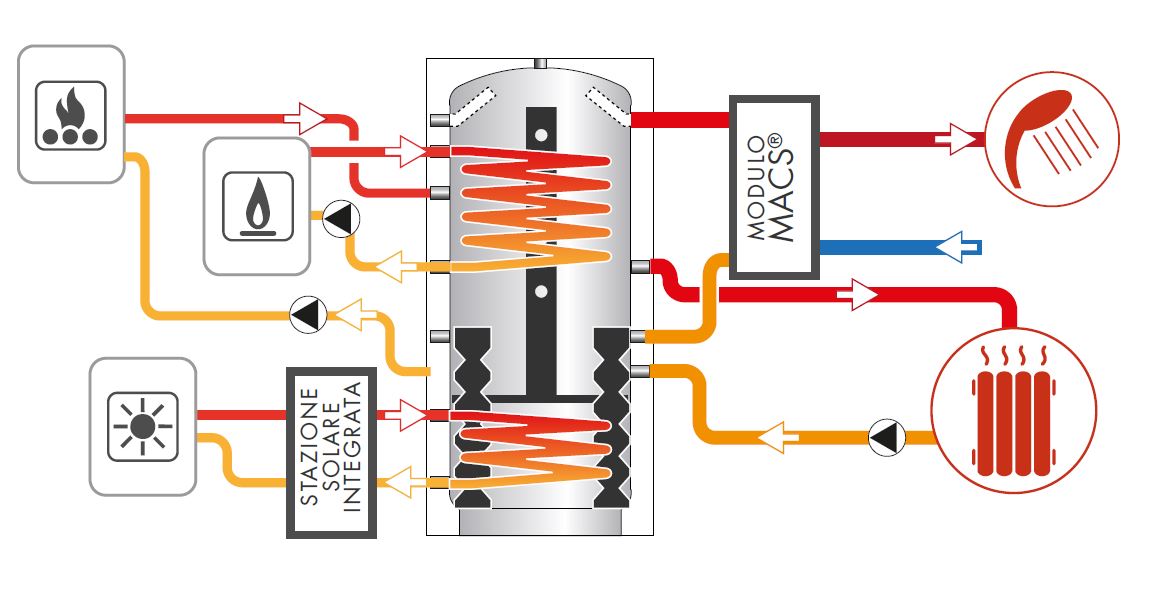 Ideale in abbinamento a un impianto solare termico, il termoaccumulatore, oltre a due scambiatori di calore in acciaio al carbonio è dotato di un innovativo sistema di caricamento termico dall’alto verso il basso (CTS®) che consente di sfruttare l’energia sin dal primo raggio di sole. Il termoaccumulatore è in grado di integrare lo sfruttamento di energia solare oltre che della biomassa e di una ulteriore terza fonte di calore.