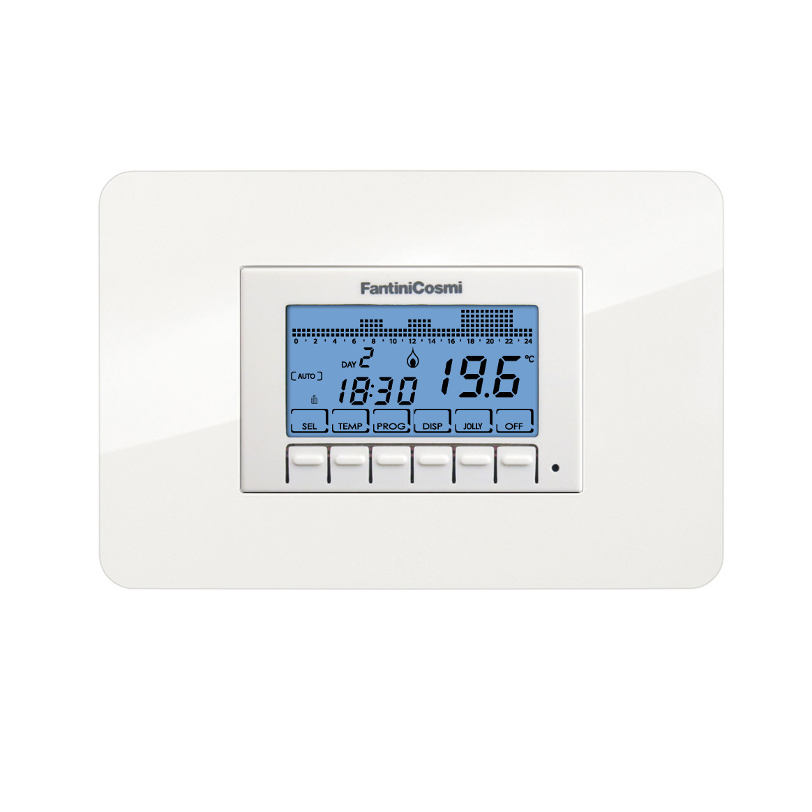 I cronotermostati CH141E (a batteria) e CH143E (a rete 230V), con programmazione settimanale per il comando di impianti di riscaldamento e di raffrescamento, dispongono di 6 tasti frontali. Il display, con retroilluminazione a LED (blu), visualizza la temperatura ambiente, l’ora in corso, il profilo di temperatura visualizzato tramite istogramma e 6 icone per la programmazione.