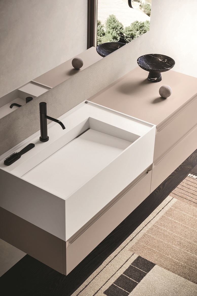 Perfetto per essere inserito in molteplici alternative di arredo proposte da Arbi Arredobagno, viene presentato l’abbinamento con una composizione appartenente alla collezione Fold, che si distingue per la presa maniglia integrata nell’anta inclinata a 45°; caratteristica che, oltre a garantire una maggiore ergonomia della presa, enfatizza l’aspetto moderno e contemporaneo delle configurazioni.