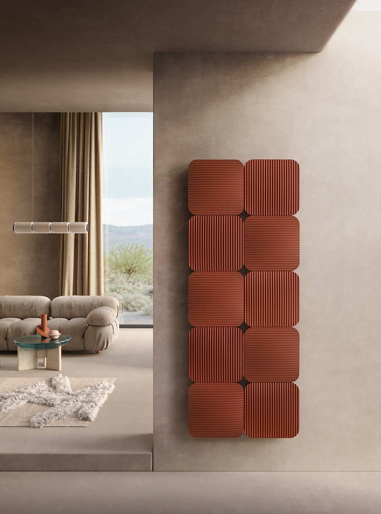L’effetto decorativo tridimensionale racconta inoltre il progetto di Lana, la collezione nata dalla collaborazione con Michele De Lucchi e lo studio AMDL CIRCLE. Il suo prende origine “dall’idea di non avere un’unica versione per un radiatore” e si sviluppa da un modulo, replicabile per creare configurazioni diverse da utilizzare a parete: una formella quadrata di 33×33 cm, con angoli stondati ed effetto bombato, ulteriormente lavorata con una plissettatura, che può creare composizioni rettangolari o ancora quadrate, grazie all’unione di due o più modelli. Con la sua forte immagine plastica, il termoarredo può essere installato in orizzontale o verticale e ha un’elevata capacità radiante, data dalla texture superficiale.