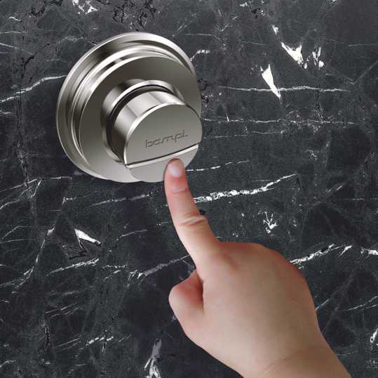 In Bampi, oltre a design e prestazioni, si è pensato alla semplicità d’azionamento. Tantissimi bagni in Italia, ancora oggi, presentano pulsanti a parete con comando pneumatico assai difficile da premere, soprattutto per i bambini. Inoltre, tali pulsanti, hanno un solo tasto senza la scelta di scarico generando quindi un considerevole spreco d’acqua.