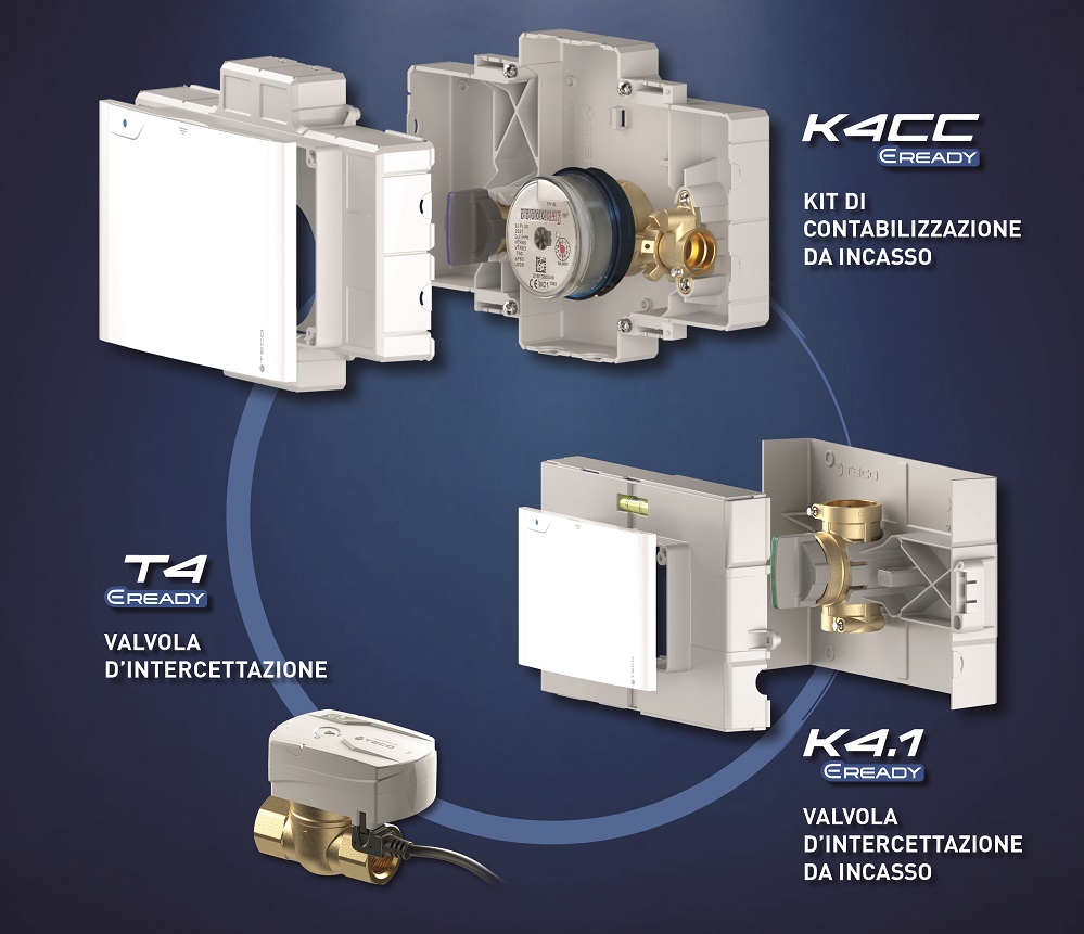 I prodotti della Serie E-Ready di Teco (Provaglio d’Iseo, BS) (valvola d’intercettazione T4 E-Ready, la versione da incasso K4.1 E-READY e il kit di contabilizzazione da incasso K4CC E-Ready) permettono la gestione da remoto di intercettazione e contabilizzazione acqua negli impianti idrici, quando viene montato il motore della Serie E100.