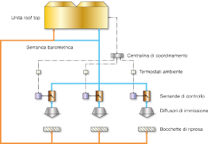Per completezza ricordiamo che questi impianti sono anche realizzabili quando l’unità roof-top in gioco è a pompa di calore. In questi casi una centralina di coordinamento deciderà interagendo con l’unità roof-top se quest’ultima deve funzionare in raffreddamento o in pompa di calore a seconda del segno algebrico della somma degli scostamenti tra le temperature effettive e le temperature impostate nei vari locali (detto in parole più semplici a seconda della prevalenza della richiesta di raffreddamento rispetto a quella di riscaldamento e viceversa).