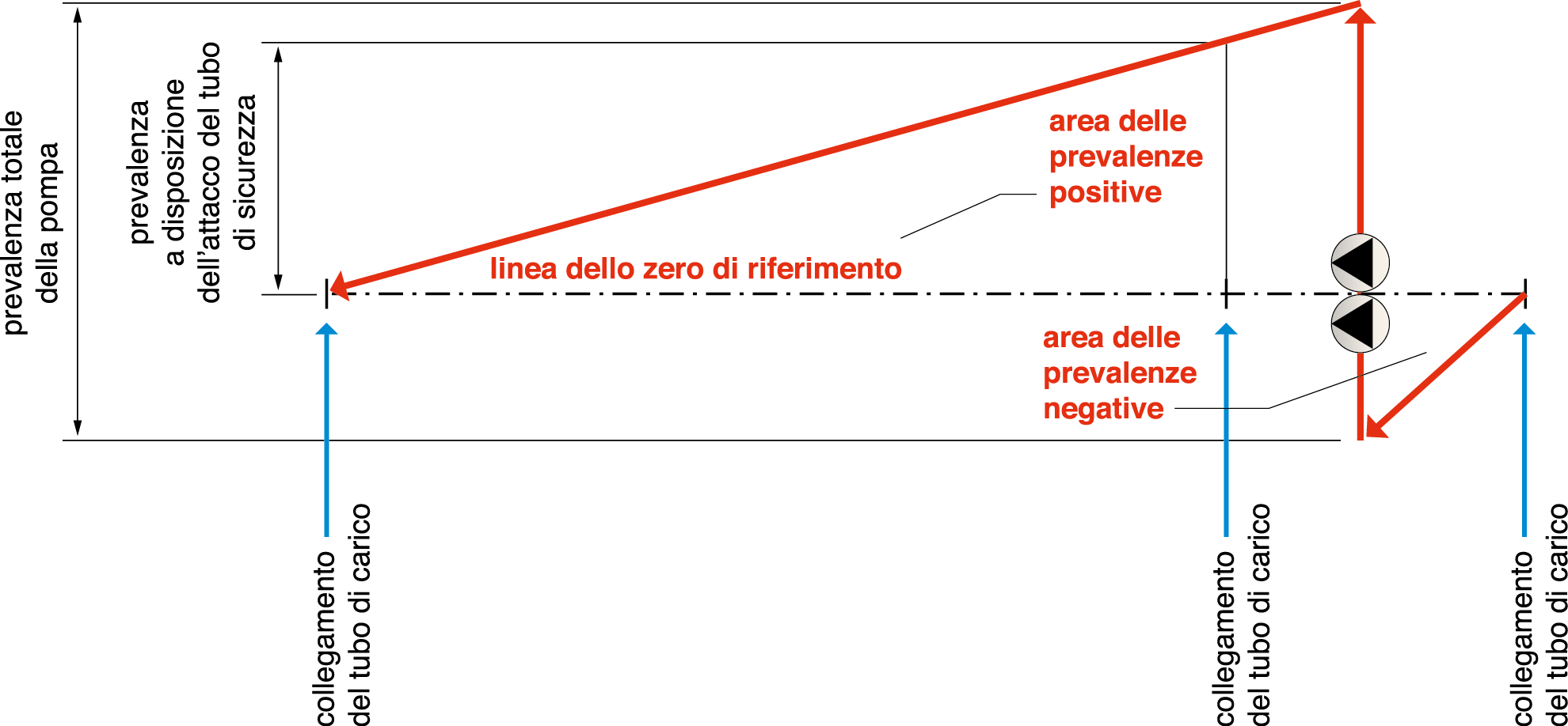L’aumento del tenore di ossigeno nell’acqua esalta il naturale processo di ossidazione del ferro con il quale sono costruite le tubazioni. La corrosione risulta inoltre esaltata in corrispondenza delle saldature dove a causa della disomogeneità dei materiali (per forza di cose il materiale di apporto non può essere chimicamente identico a quello delle parti saldate…) si creano coppie galvaniche di innesco della corrosione che sono tanto più attive quanto più l’acqua è ricca di ossigeno.Per eliminare i fenomeni di corrosione occorre eliminare il problema di fondo che è la ricaduta d’acqua dal tubo di sicurezza nel vaso d’espansione. Nel caso sottopostoci dal lettore la ricaduta d’acqua è dovuta dall’errato posizionamento del tubo di carico dell’impianto che, come si può vedere dallo schema della centrale, è collegato a monte delle pompe che a loro volta si trovano a monte della caldaia alla quale è collegato il tubo di sicurezza. Poiché in un circuito chiuso la prevalenza erogata dalle pompe cessa di essere positiva e diventa negativa nel punto di collegamento del tubo di carico, in questo caso il collegamento del tubo di sicurezza avviene in una zona in cui la prevalenza positiva della pompa è ancora relativamente alta. Questo concetto che è abbastanza astruso è chiarito nel diagramma di cui alla Figura 2 nel quale l’andamento della prevalenza della pompa è stato “svolto” e linearizzato. La prevalenza positiva nel punto di collegamento fa in modo che l’acqua venga spinta attraverso il tubo di sicurezza e da esso ricada nel vaso di espansione gorgogliando ed arricchendosi di ossigeno. Precisiamo inoltre che l’approvazione ISPESL era stata secondo noi concessa in quanto l’impianto è perfettamente a Norma ed infatti le bucature delle tubazioni per corrosione non sono pericolose ne hanno mai arrecato danni ad alcuno.