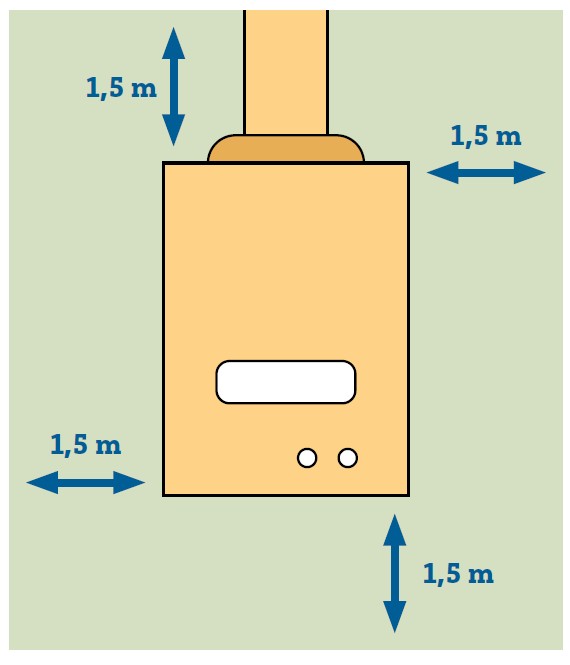 In effetti la UNI 7129-2:2015, ma che tratta impianti di potenzialità inferiore ai 35 kW al capitolo 4 Installazione degli apparecchi di utilizzazione dettaglia indistintamente al comma 4.1 Prescrizioni generali – Gli apparecchi a gas devono essere installati ad una distanza di almeno 1,5 m da eventuali contatori, siano essi elettrici o del gas (figura 1)