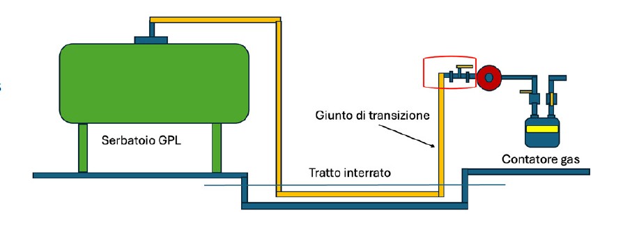 «In riferimento alla normativa UNI 9860:2022*, è possibile l’utilizzo di una tubazione in rame a valle del riduttore di pressione di 1° stadio e giunto di transizione, ma a monte di quello di 2° stadio, fuori terra? Il tratto nel riquadro rosso è quello che intendo. Qui accanto un’immagine per chiarire il quesito», chiede un lettore di GT.