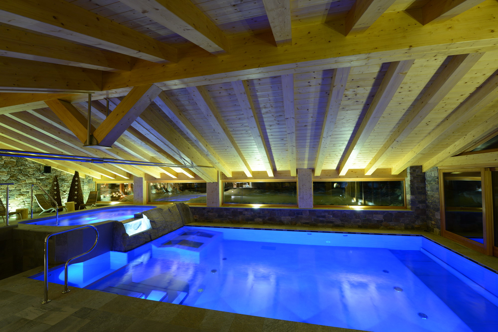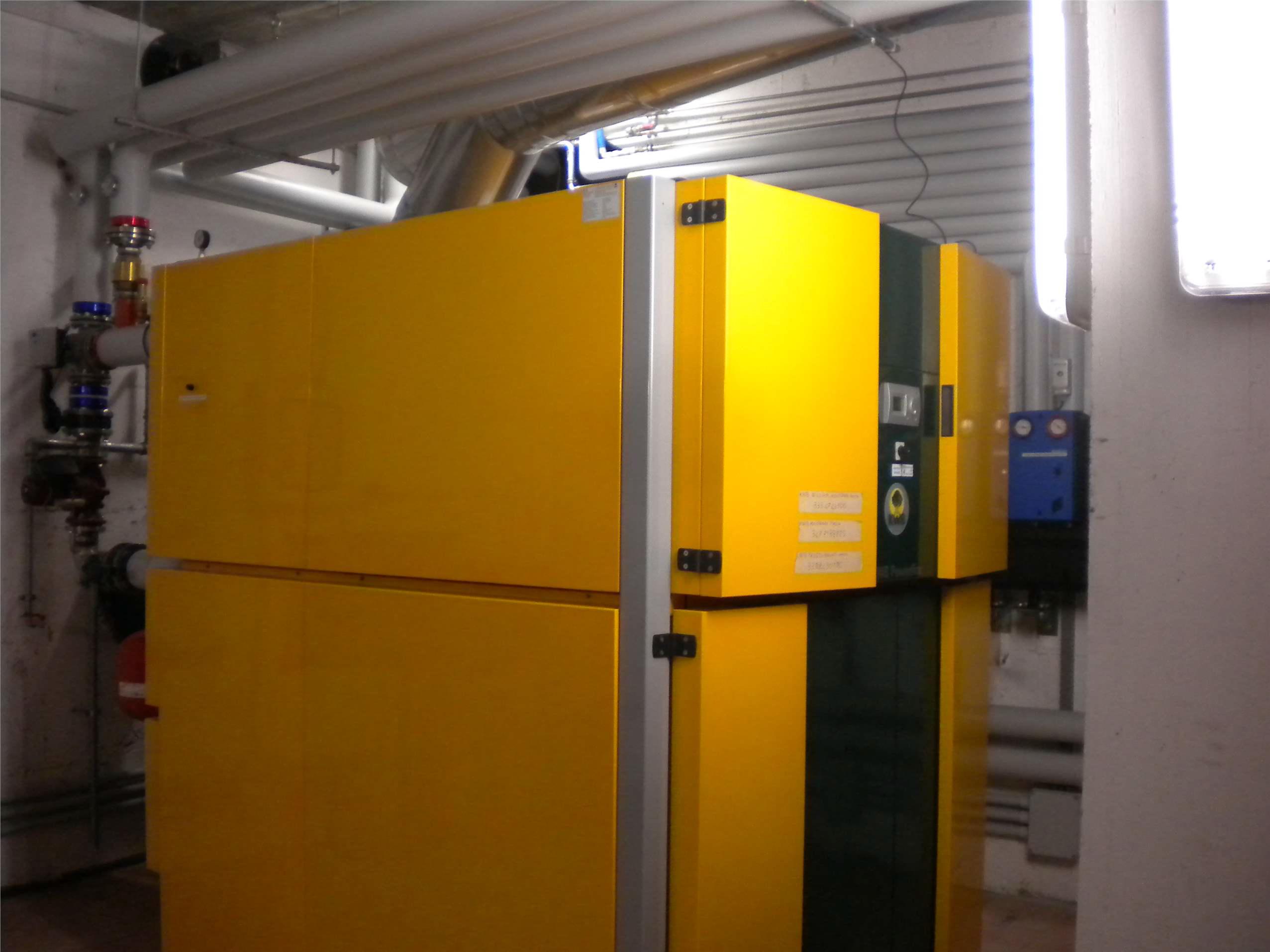Due pannelli di controllo gestiscono i gruppi pompe dedicati al riscaldamento dell’hotel Sant’Orso e quelli dell’hotel Gran Paradis in teleriscaldamento allo scopo di regolare le temperature di mandata in funzione delle effettive necessità degli stabili e la temperatura esterna registrata da un’apposita sonda, attingendo l’acqua tecnica da un puffer da 1000 litri per ogni hotel. Le caldaie a gasolio esistenti sono state lasciate comunque collegate ma in stand-by per essere utilizzate in caso di emergenza. Il centro benessere è riscaldato tramite impianto a pavimento a bassa temperatura con l’aggiunta di termosifoni ad alta temperatura per un rapido riscaldamento degli ambienti comprese le zone massaggio, mentre la gestione della temperatura di ogni singola stanza viene gestita e controllata direttamente dalla reception. L’acqua della piscina viene riscaldata da uno scambiatore alimentato dall’acqua tecnica di riscaldamento del puffer scaldata dalla caldaia a biomassa in inverno, mentre in estate ciò avviene direttamente dai pannelli solari.