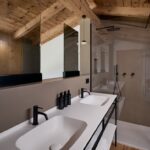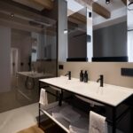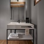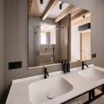 Nei bagni privati, PLANIT ha realizzato tutti i top con lavabi integrati dei modelli Stella e Ibis, due soluzioni diverse ma accomunate da una coerenza estetica e funzionale: Stella, con le sue geometrie addolcite, suggerisce ordine e contemporaneità; Ibis, dalle curve piene e armoniche, ispira comfort ed equilibrio. Completano il progetto tutti i piatti doccia Campo, gli elementi contenitivi in metallo verniciato su misura della serie Infinity Metal, e superfici funzionali coordinate.