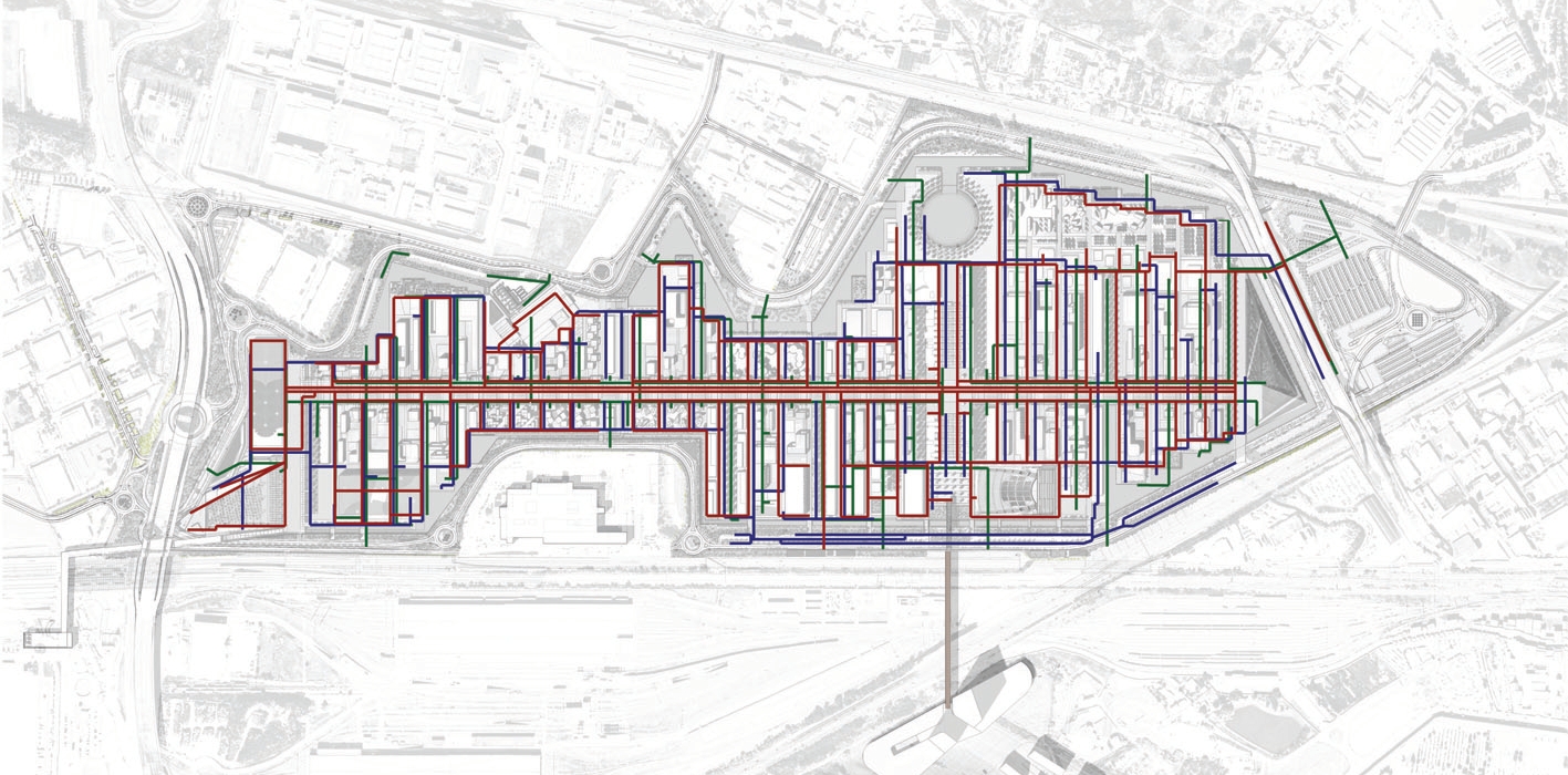 Il sito espositivo con le reti impiantistiche: le dorsali di distribuzione dell'acqua potabile e sanitaria (arancione e marrone) sotto il Decumano