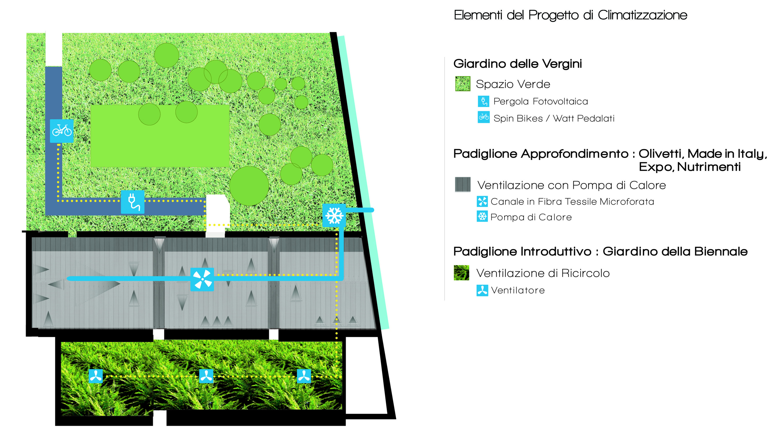 Proprio dalle risorse a disposizione è partita l’idea di realizzare un impianto di climatizzazione con un gruppo frigorifero, anche pompa di calore, in quanto invertibile sul lato idraulico, condensato con acqua di laguna, alimentato con una pergola fotovoltaica.