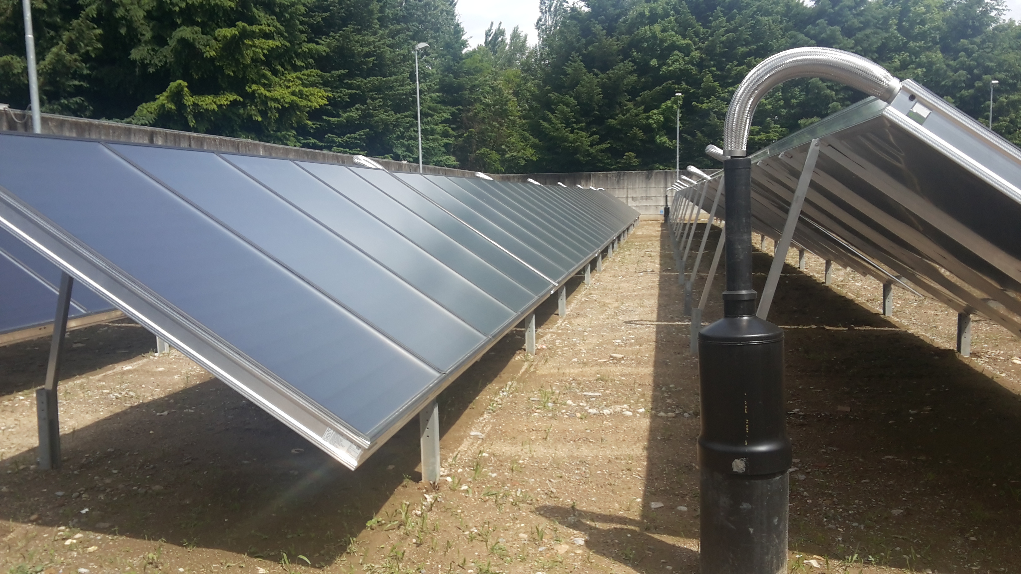A seconda della loro posizione, le file sono composte da 7, 10 e 11 pannelli collegati in serie. Inclinati di 35°, i collettori sono stati posati utilizzando una gru mobile e appoggiano sopra pali in acciaio infissi a terra. Anche le tubazioni corrono nel sottosuolo che, in questo modo, contribuisce al contenimento delle dispersioni.