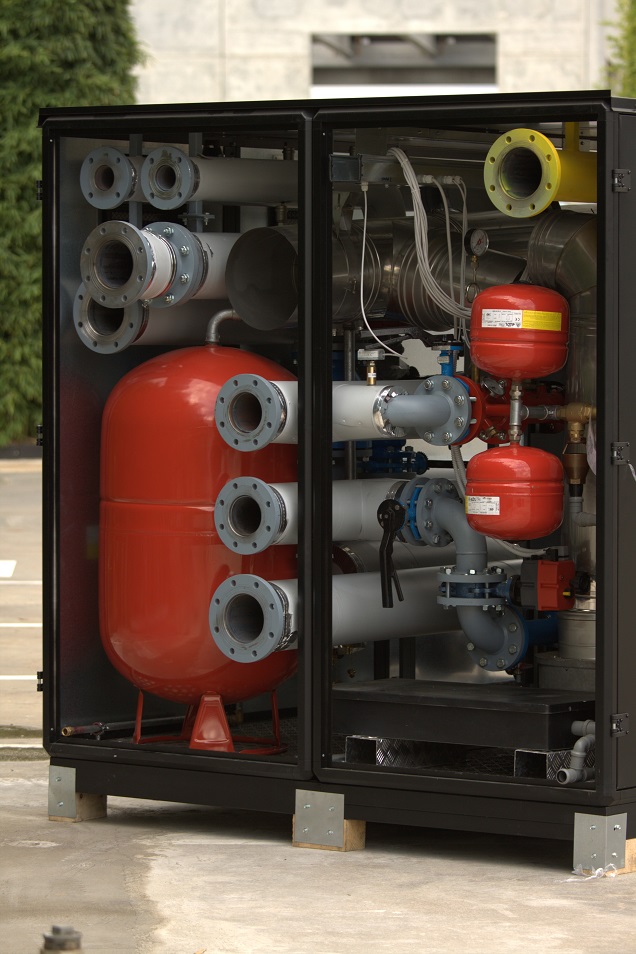 All’interno del box è stato installato uno scambiatore a piastre da 1 MW, un collettore di mandata e uno di ritorno opportunamente bilanciati in DN 125 con riduzione di sezione, 2 circolatori intercettabili collegati in parallelo. Tutte le tubazioni interne al box sono state coibentate, collettori compresi.