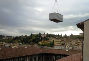 Lunedi 25 novembre 2013 era giorno di sciopero della scuola e della sanità. Era una giornata tersa, ma ventosa. Proprio per questo, non senza qualche apprensione, un carro gru dotato di un braccio telescopico estensibile fino a quasi cento metri, ha sollevato dal piazzale fin sui tetti degli Uffizi, per 40 metri, le due nuove torri evaporative dell’impianto di condizionamento del museo. Le vecchie, infatti, non garantivano più la necessaria efficienza dell’impianto, erano state installate posizionando un Autogru da 50t in via dei Georgofili, a quel tempo accessibile per la presenza del cantiere di ristrutturazione dopo la bomba del 1993. Per farci raccontare tutto siamo andati dall’installatore che materialmente ha eseguito i lavori, Daniele Mazzoni della Mazzoni Andrea & C srl di Montespertoli.