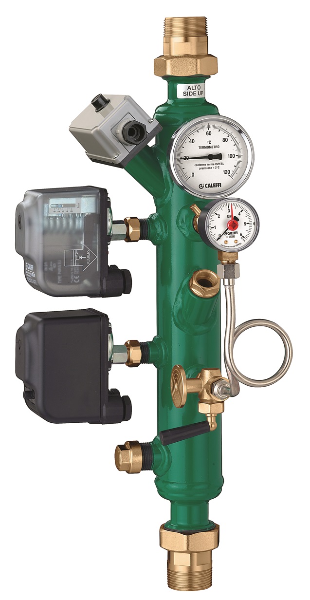 Il collettore portastrumenti e accessori raggruppa in poco spazio una serie di dispositivi certificati e tarati a banco, conformi INAIL, che vanno installati obbligatoriamente nelle centrali termiche dalla potenzialità superiore a 35 kW. Può essere attraversato dal fluido in entrambi i versi di percorrenza.