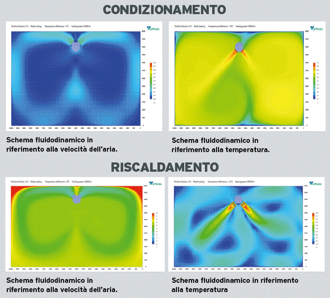 Massima efficienza in condizionamento e in riscaldamento. Inoltre: si riduce il numero dei diffusori utilizzati; non ci sono correnti d’aria durante il raffreddamento riducendo in questo modo i reclami e il disagio nelle zone di lavoro sottostanti, assicurando comfort al personale; non ci sono fenomeni di stratificazione dell’aria in fase di riscaldamento ottenendo un risparmio energetico attorno all’8-10%.
