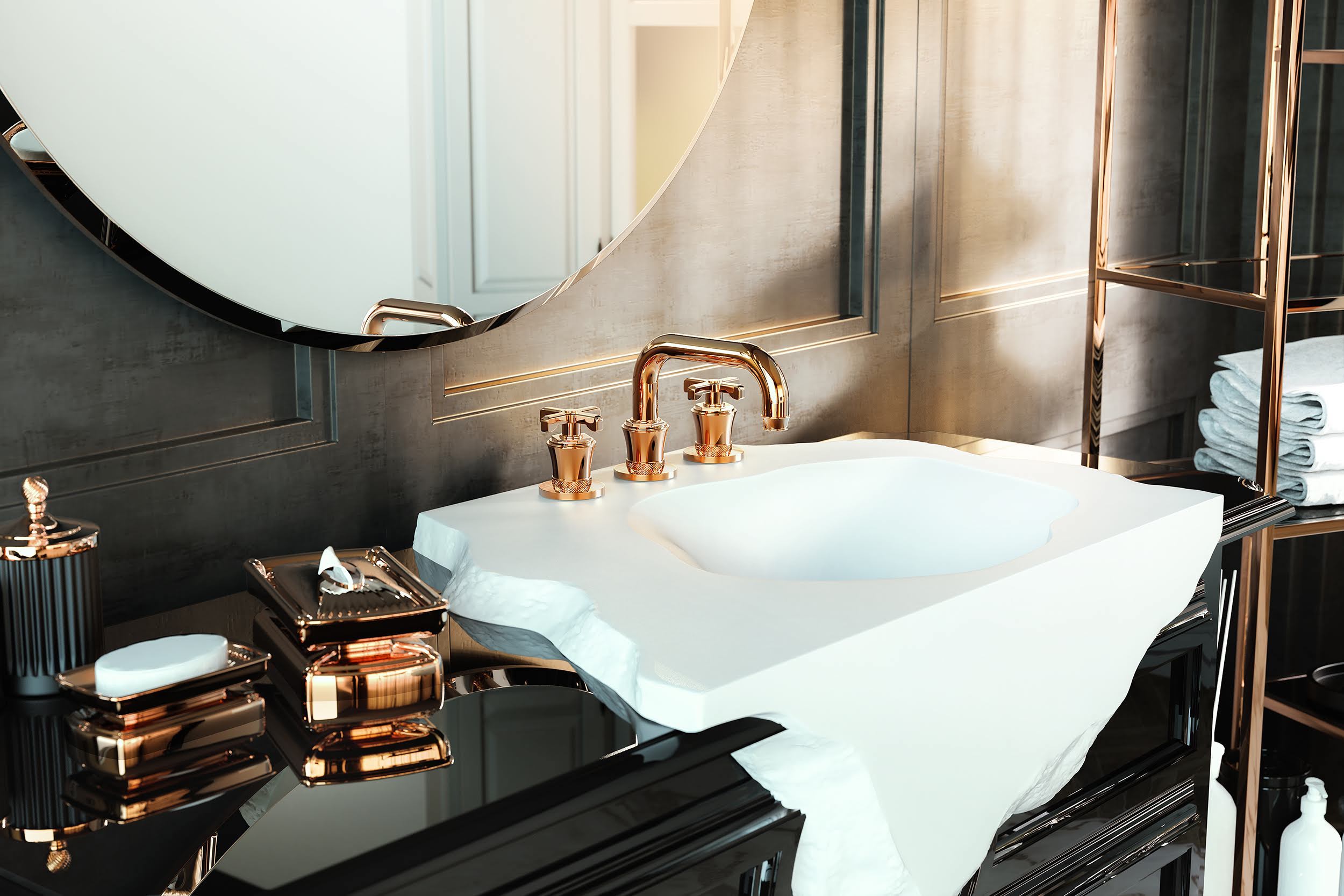 Vignola nella versione oro 24Kt valorizza l’architettura e il design degli spazi bagno con uno stile esclusivo e luxury.