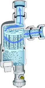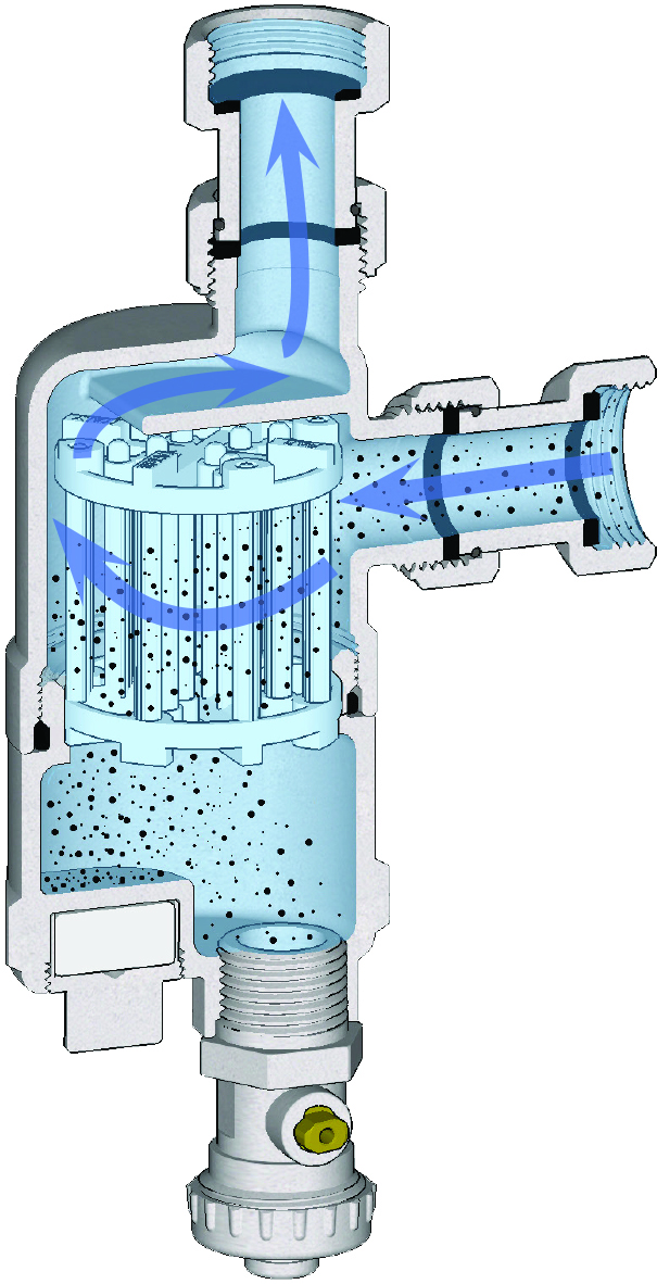 All’interno del defangatore è inserita una cartuccia filtrante, costituita da barrette verticali e posta in posizione trasversale rispetto alla direzione del fluido, che rallenta e ferma la corsa delle particelle. Le impurità, presenti nelle tubazioni del circuito di distribuzione, si depositano nella parte inferiore della camera di raccolta.