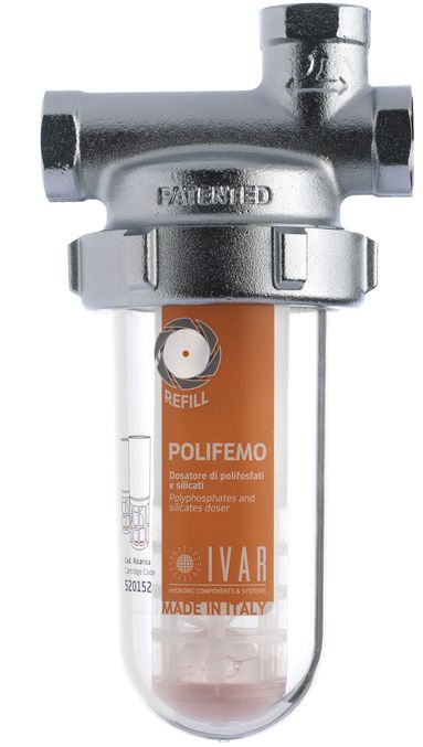 Il dosatore di polifosfati POLIFEMO è un prodotto per il trattamento delle acque, progettato da IVAR, per essere installato sulle tubature che portano l’acqua nella caldaia o in altre apparecchiature quali lavatrici e lavastoviglie o scaldabagno, al fine di ridurre la presenza di calcare. I polifosfati rilasciati da POLIFEMO creano infatti una pellicola di protezione nelle tubature, utile a evitare la corrosione causata dal calcare, ed è quindi particolarmente utile in presenza di acqua dura o molto dura.
