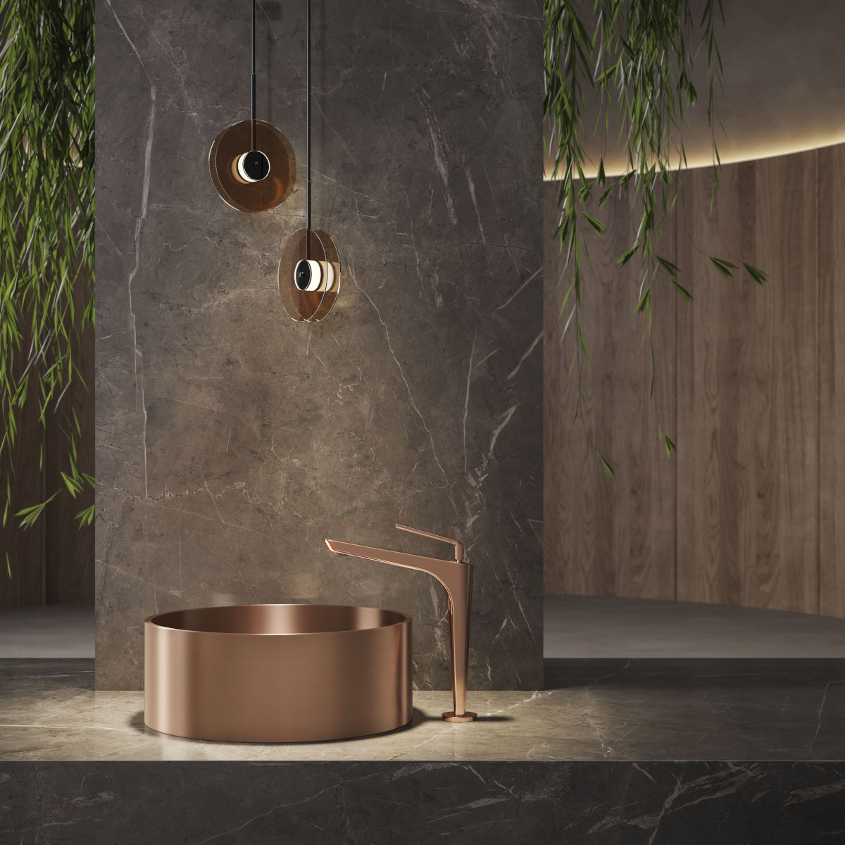 La ricerca materica si integra con la forma circolare dei lavabi, per un effetto di pura eleganza capace di attraversare tempi e luoghi di qualsiasi ambiente bagno.