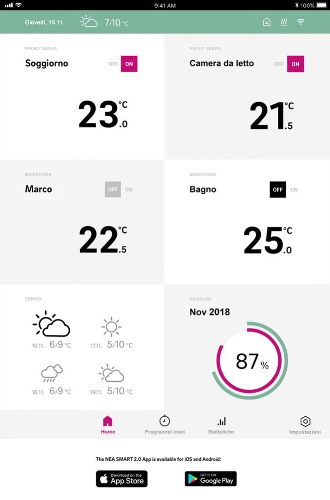 Grazie alle sue funzioni intelligenti, NEA SMART 2.0 impara dalle abitudini di climatizzazione e di utilizzo degli utenti per evitare sprechi energetici, assicurando un risparmio energetico fino al 20%, e può essere gestito sia manualmente tramite i termostati di design con display LED che ovunque ci si trovi con l’intuitiva App. Quest’ultima rende possibile monitorare l’energia utilizzata, ricevere informazioni sullo stato dell’impianto, usufruire degli aggiornamenti e, come optional, della manutenzione software da remoto, consentendo di adattare le impostazioni in modo rapido ed efficace.