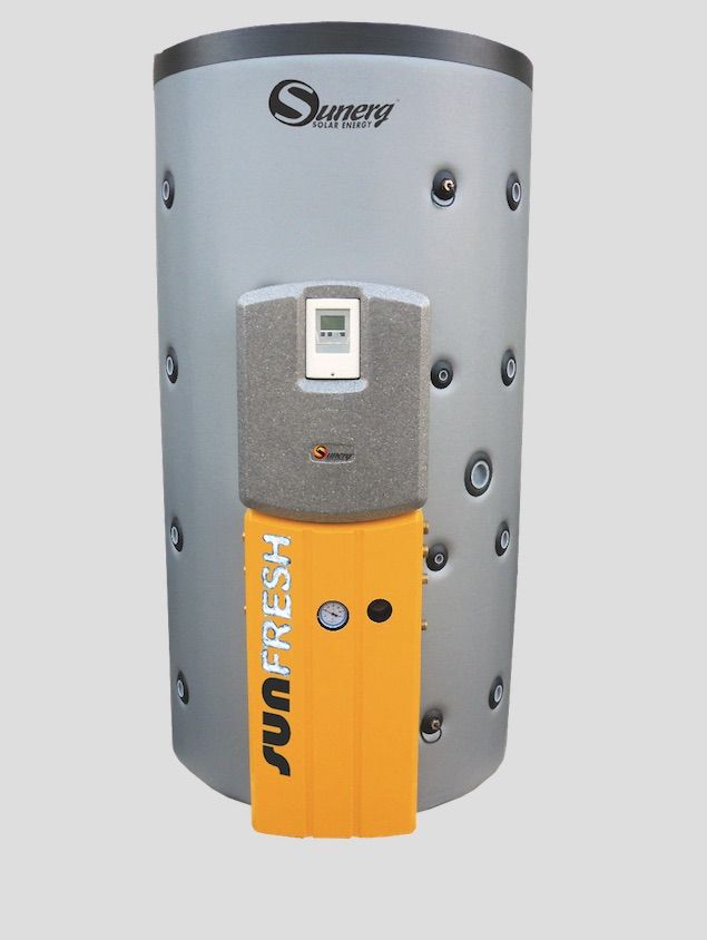 Il bollitore SUNFRESH è il componente innovativo dell’impianto e contiene acqua calda tecnica. Su di esso sono preinstallati il gruppo di produzione sanitario istantaneo e il gruppo pompa solare. Il bollitore, ideale per il collegamento alle pompe di calore, viene consegnato già completamente cablato e con un’unica centralina di gestione già configurata. La produzione di acqua calda sanitaria viene regolata elettronicamente grazie alla presenza del sensore VFS (Vortex Flow Sensor) che rileva, istante per istante, la temperatura e la portata dell’acqua calda sanitaria richiesta dalle utenze. Il sistema comprende una pompa ad alta efficienza per il ricircolo dell’acqua calda sanitaria e la funzione può essere attivata o meno in base all’esigenza. La produzione istantanea di ACS elimina problemi di igiene dell’acqua sanitaria, come ad esempio la formazione di legionella.