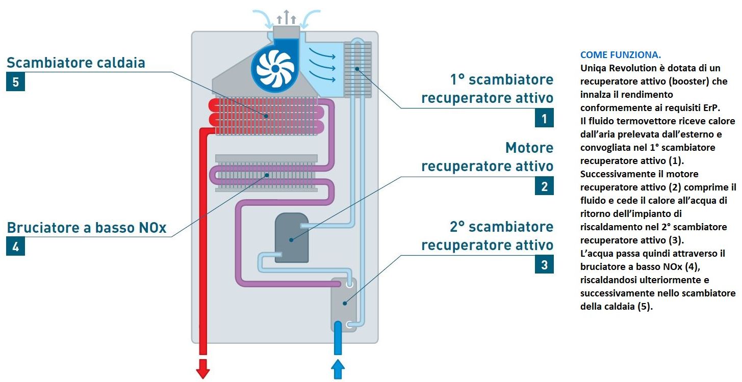 Il mercato italiano del riscaldamento si basa soprattutto sul rinnovo dei generatori termici esistenti: in caso di sostituzione di una caldaia “turbo”, quando è possibile va installata una caldaia a condensazione. In tutti gli altri casi, quando non si può o è troppo oneroso realizzare gli scarichi condensa e adeguare i camini alle esigenze delle caldaie a condensazione, può essere conveniente installare una soluzione alternativa come Uniqa Revolution.