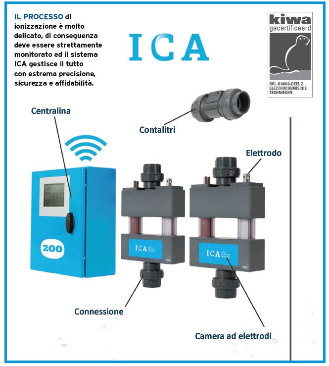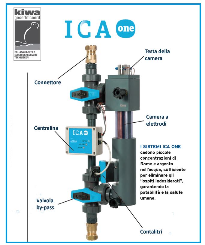 I sistemi ICA cedono piccole concentrazioni di rame ed argento nell’acqua, sufficiente per eliminare gli “ospiti indesiderati”, garantendo la potabilità e la salute umana. Garantiscono una copertura migliore rispetto a altri prodotti chimici comunemente utilizzati in ambito civile/industriale: garantisce fino a 5settimane di copertura contro le 48 ore di un prodotto chimico ossidante. Rame ed argento sono noti metalli con proprietà batteriostatiche fin dall’antichità, in passato i nostri antenati gettavano argento e monete metalliche in pozzetti e serbatoi per contenere la crescita dei batteri nell’acqua. Il processo di ionizzazione è molto delicato, di conseguenza deve essere strettamente monitorato ed il sistema ICA gestisce il tutto con estrema precisione, sicurezza e affidabilità. Inoltre, tutti i sistemi sono monitorabili via internet in qualsiasi momento.